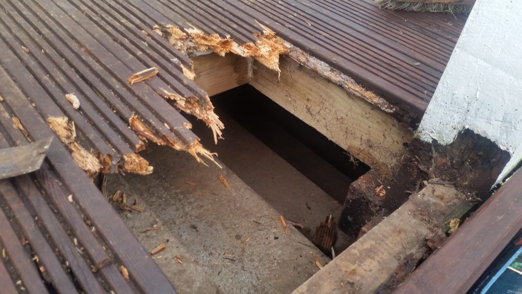 Boards collapsed! Much to our horror, rotten decking boards just outside the back door...