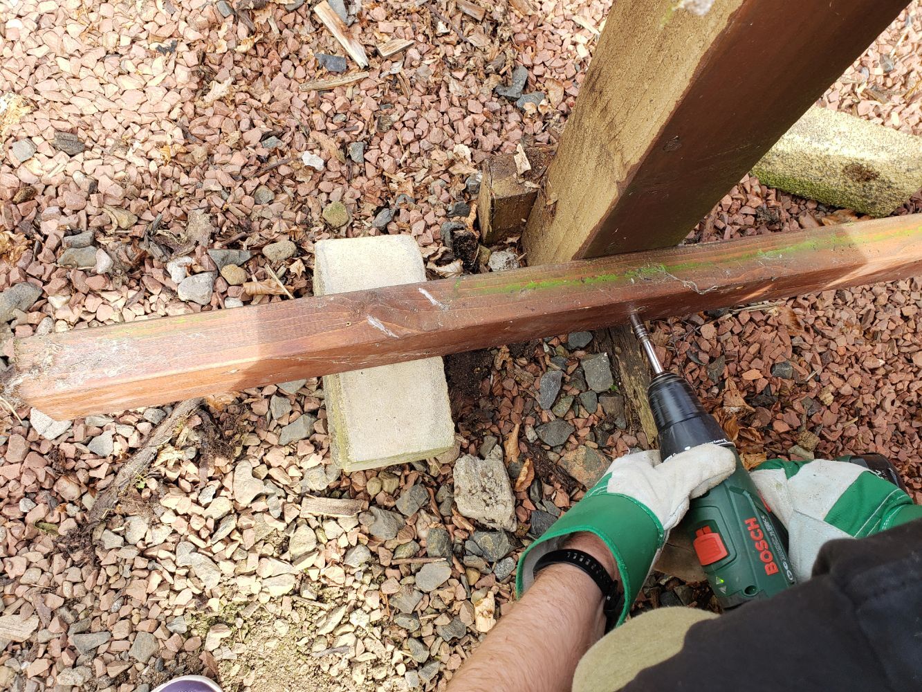 The builder had decided to chuck in bricks and large stones in the base of each post, cemented to the wall and of course those parts weren’t rotten.. they had to come out!